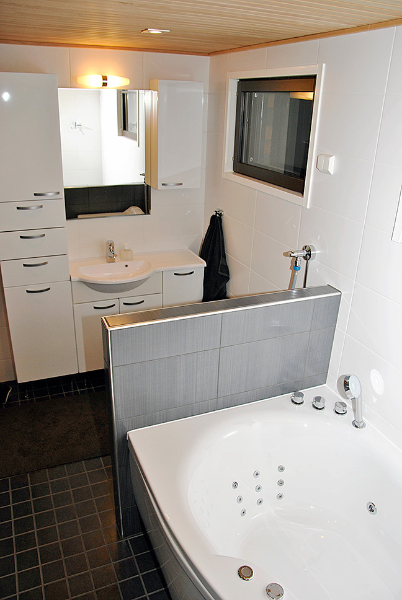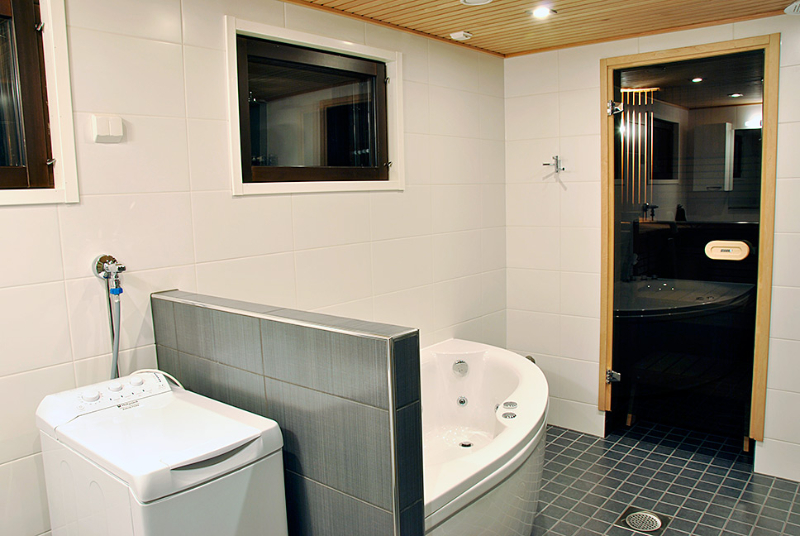 Nyt kylpyhuoneen kaadot on tehty oikein, pesukone on suojattu väliseinällä ja saunassa on enemmän laudetilaa, vaikka sauna onkin kooltaan aiempaa pienempi. Saunan pienentämisen ansiosta tilaan mahtui lasten haaveilema poreallas.